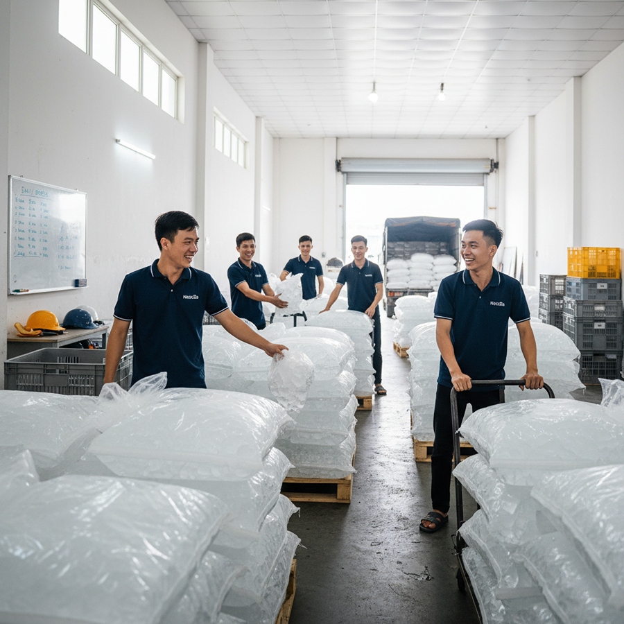 Hệ thống của chúng tôi phủ sóng khắp 24 quận huyện tại TPHCM, với kho lạnh đạt chuẩn HACCP và đội xe giao hàng hoạt động liên tục. Mỗi block nước đá được sản xuất từ nguồn nước qua hệ thống lọc RO 5 tầng, đảm bảo độ trong suốt và an toàn tuyệt đối.